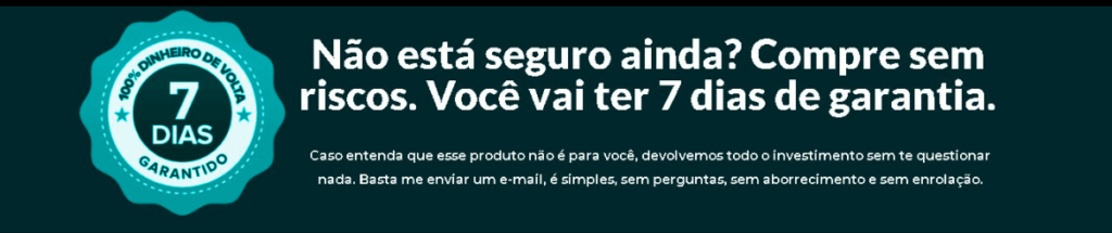 VOCÊ TERÁ 7 DIAS DE GARANTIA. CASO ENTENDA QUE ESSE PRODUTO NÃO É PARA VOCÊ,DEVOLVEMOS TODO O INVESTIMENTO SEM TE QUESTIONAR NADA. BASTA ENVIAR UM E-MAIL,É SIMPLES, SEM PERGUNTAS, SEM ENROLAÇÃO.